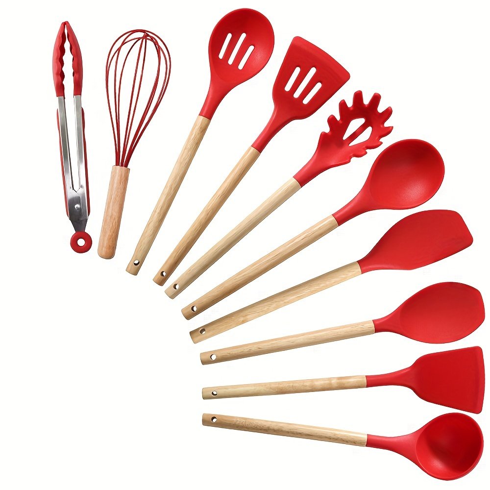10pcs/set Silicone Cooking Utensils Set for Kitchen, Heat Resistant Non-Stick Cooking Set with Wooden Handle Spatula Turner Spoon Tongs Whisk