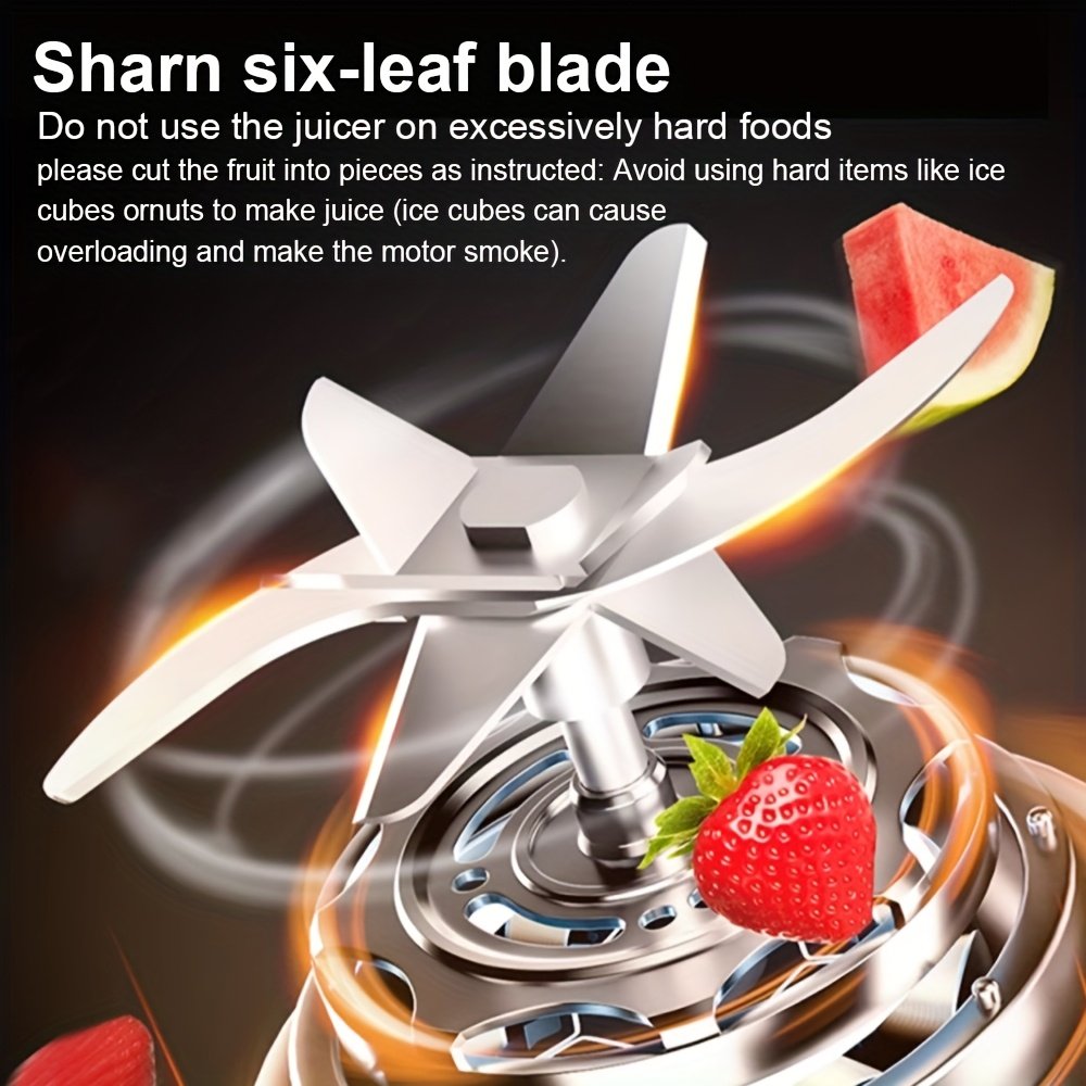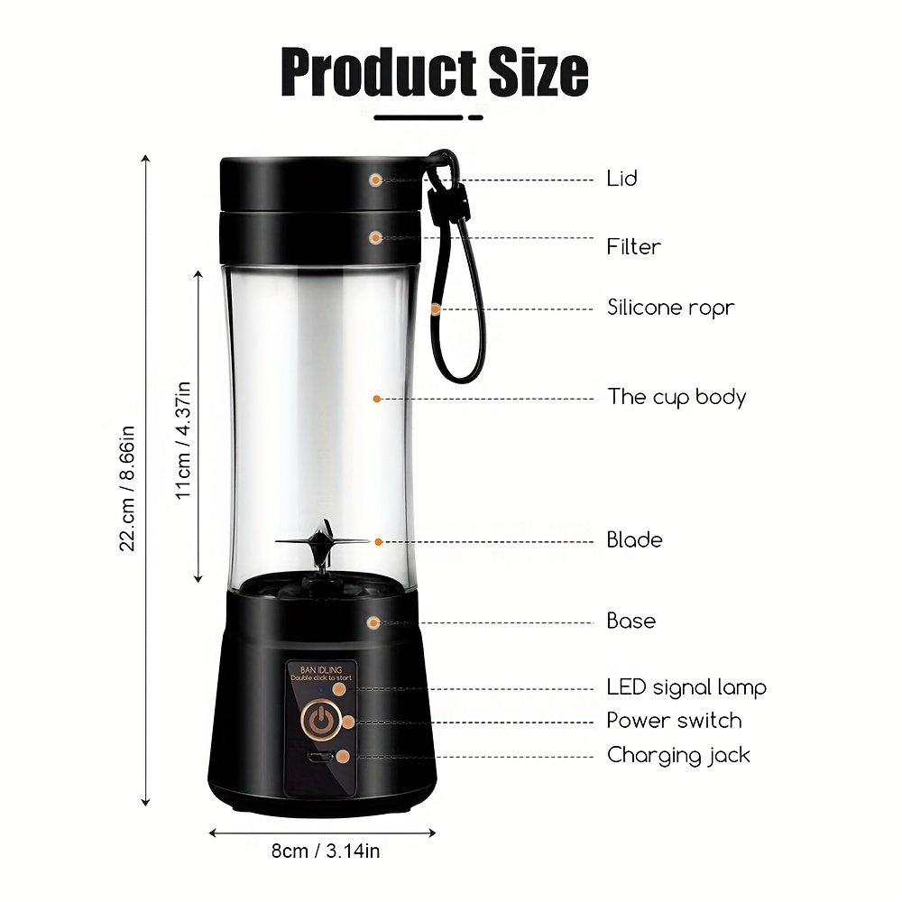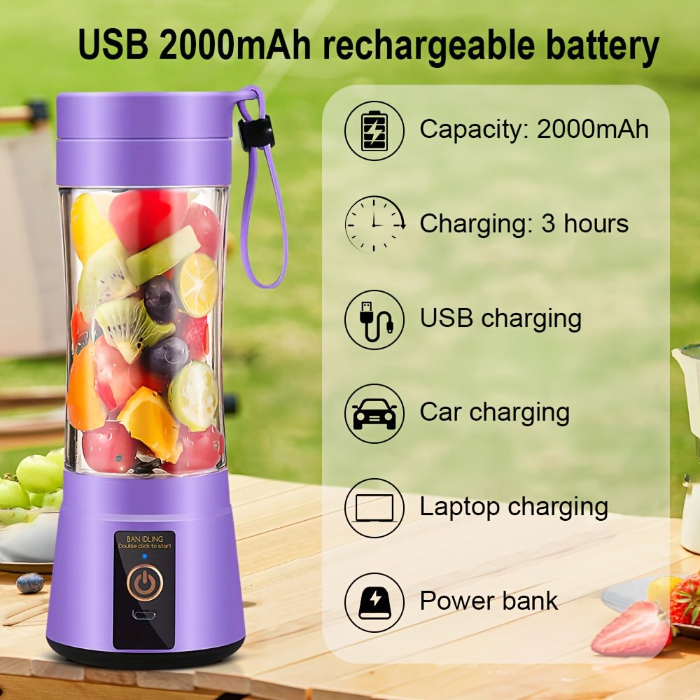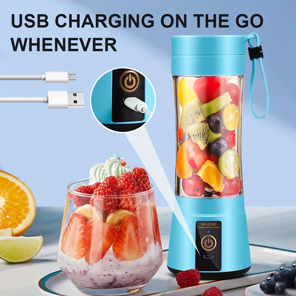 12.85 Oz Portable Blender, a compact 6-blade mixer ideal for smoothies, milkshakes, and juices. This mobile hand juicer is USB rechargeable, perfect for travel, office use, or picnics. It features a lightweight design, high-speed motor, and durable construction, making it suitable for fitness enthusiasts and office workers alike.