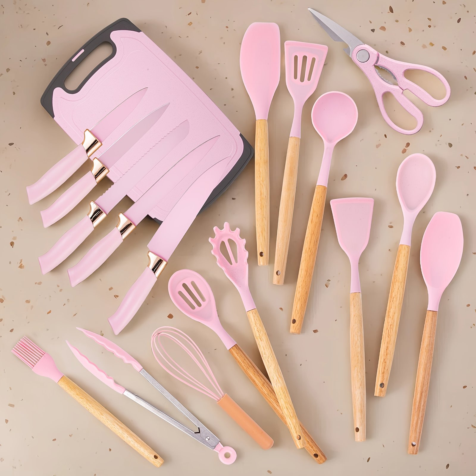 19pcs Kitchen Knife And Utensil Collection, Featuring a Nonstick Black Knife Set with Wooden Grips, Silicone Cooking Tools, a Cutting Board, Scissors, And a Holder, Ideal Gift for Parents