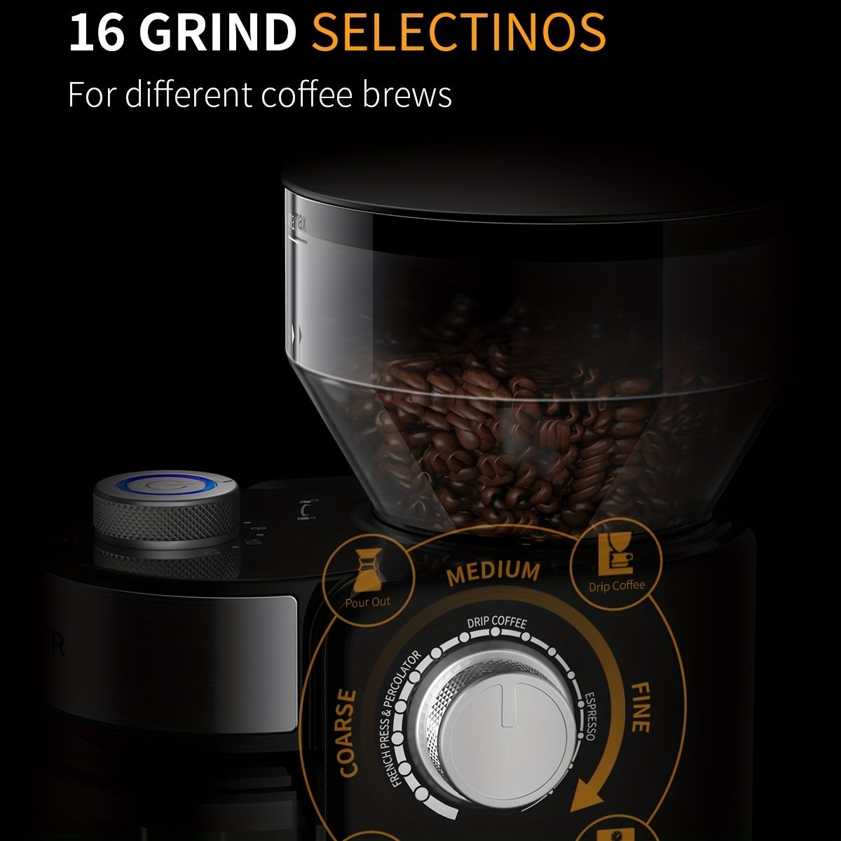 Electric Coffee Grinder With Adjustable Burrs, 16 Precise Grinder Settings For 2-14 Cups, Black.