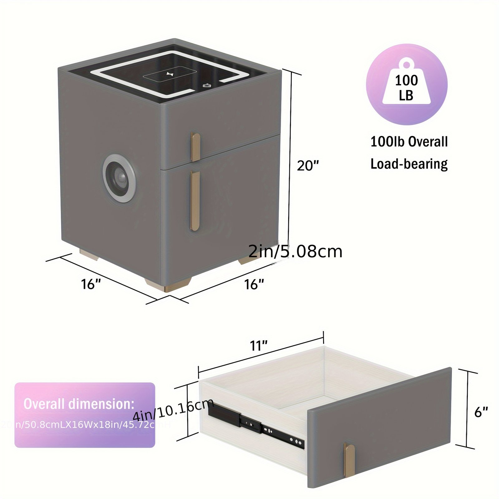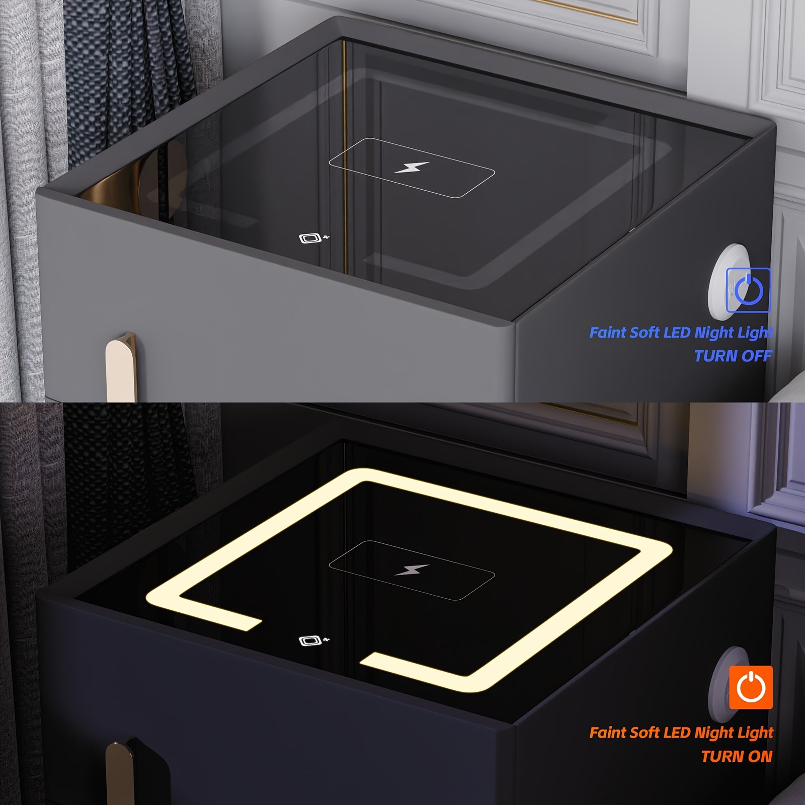This gray nightstand blends minimalist style with practicality. Its tabletop features a built-in lighting function—soft, warm light emits gently when you touch it, perfect for nighttime reading or subtle ambient glow.