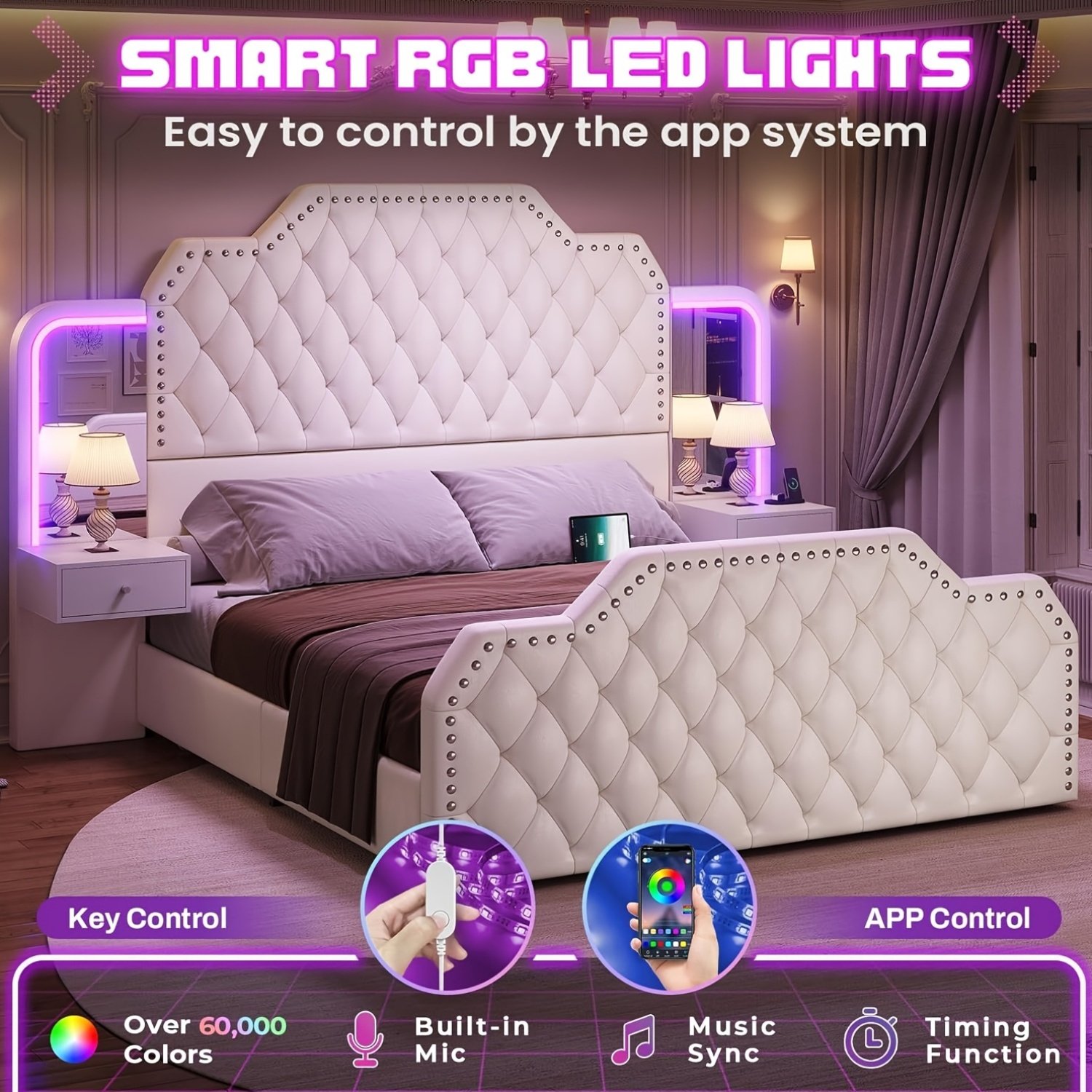 The bed frame includes an RGB LED light strip, can be controlled through an app, offers over 60,000 colors, and has 29 different flashing modes for you to select from.