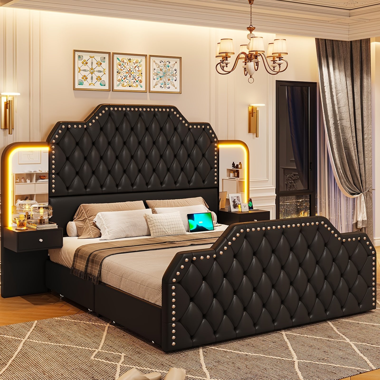 Queen Size Bed Frame with 2 Nightstands with Mirror, Modern Platform Bed Frame with 53″ Tall Headboard and 4 Storage Drawers